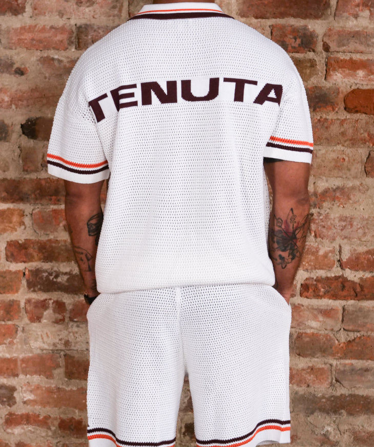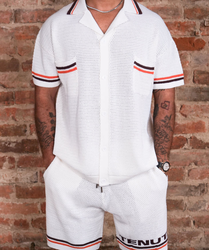 Premium heavy weight shirt & short set white with brown and orange stripes and brown logo